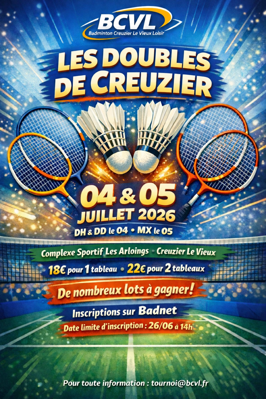 Le BCVL vous invite à participer au Tournoi adulte en Double Dame, Double Homme (Le 04/07) et Double Mixte (Le 05/07) de Creuzier le Vieux